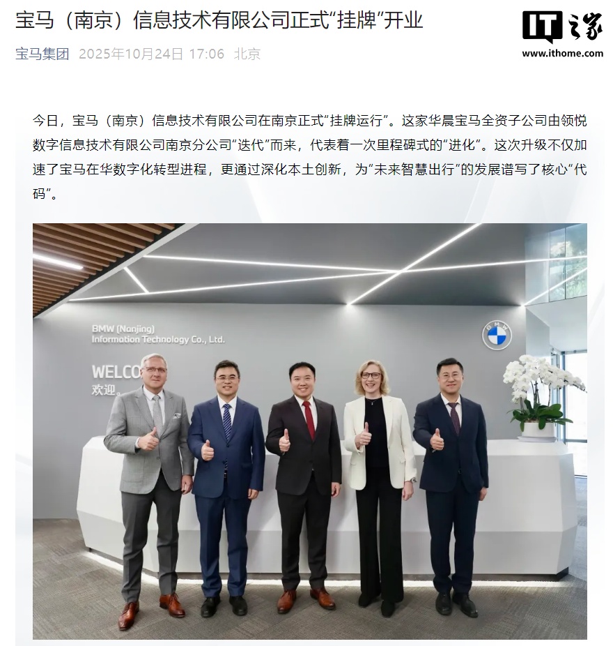 10月24日,寶馬集團宣布寶馬(南京)信息技術(shù)有限公司在南京正式掛牌運行。這是寶馬集團全球六大信息技術(shù)中心之一,也是其在華設(shè)立的首個且唯一的信息技術(shù)中心,標志著寶馬集團在全亞洲規(guī)模最大的信息技術(shù)創(chuàng)新基地的成立。領(lǐng)悅南京自2021年成立以來,為寶馬在華運營企業(yè)提供IT技術(shù)解決服務(wù),并為寶馬集團中國及部分全球市場提供全價值鏈數(shù)字化解決方案,是寶馬集團在華的三大創(chuàng)新軟件公司之一。