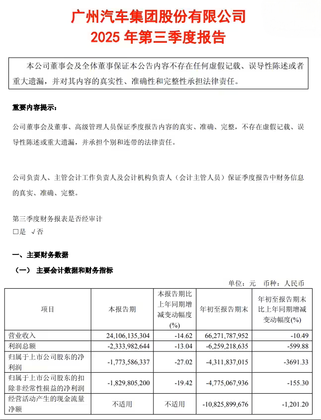 10月24日,廣汽集團(tuán)發(fā)布了2025年第三季度報(bào)告。報(bào)告期內(nèi),2025 年第三季度營(yíng)業(yè)收入為 241.06 億元,同比減少 14.63%;歸屬于上市公司股東的凈虧損 17.74 億元;年初至報(bào)告期末的凈虧損 43.12 億元。汽車(chē)銷(xiāo)量為42.84萬(wàn)輛,環(huán)比上升11.49%。前三季度累計(jì)銷(xiāo)售汽車(chē)118.37萬(wàn)輛,累計(jì)合并營(yíng)業(yè)總收入669.29億元。