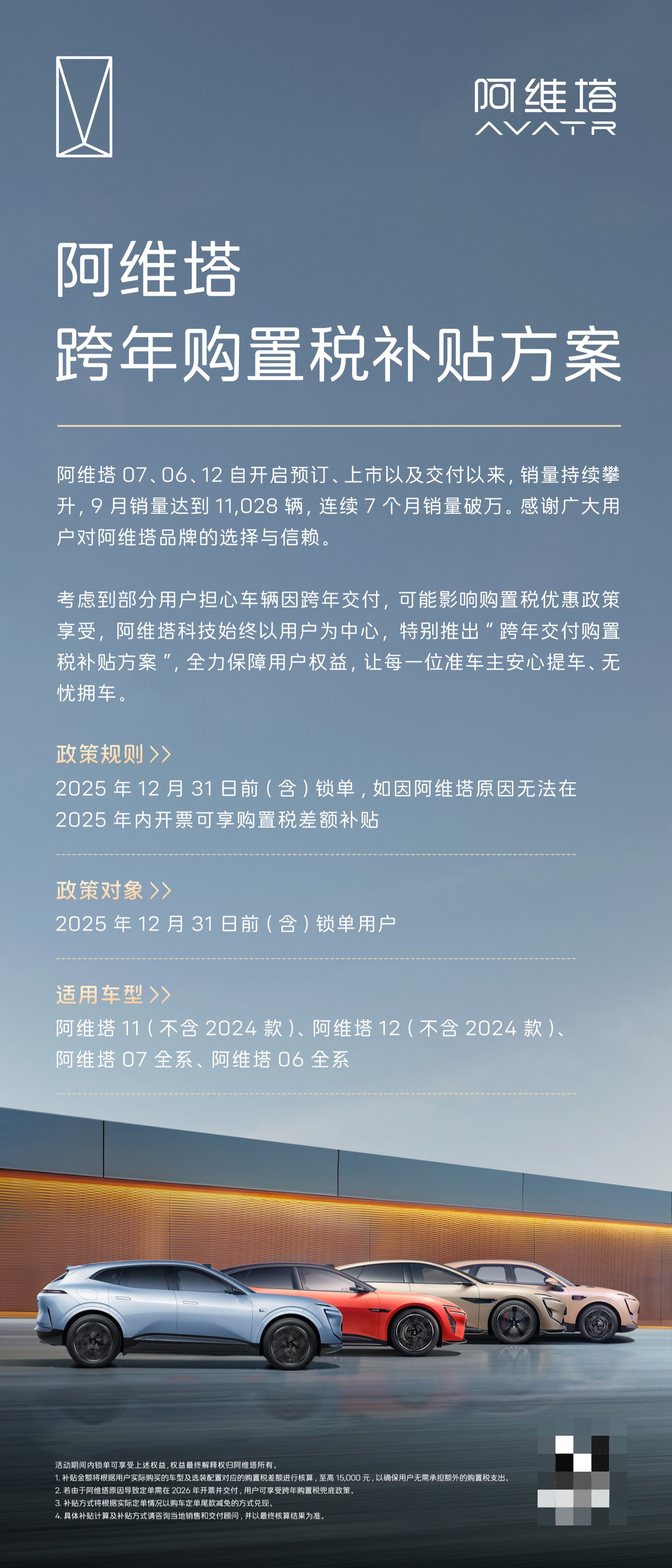 補(bǔ)貼方案,針對(duì)2025年12月31日前完成鎖單的用戶,若因阿維塔原因需在2026年交付,用戶可享受購置稅差額補(bǔ)貼。該政策適用于阿維塔11、阿維塔12(均不含2024款)、阿維塔07全系、阿維塔06全系車型。長安汽車也發(fā)布公告,為消除用戶對(duì)跨年開票及交付可能導(dǎo)致購置稅優(yōu)惠減少的顧慮,旗下全品牌推出購置稅補(bǔ)貼方案,適用于2025年11月30日前在官方線上系統(tǒng)完成鎖單的用戶,具體補(bǔ)貼標(biāo)準(zhǔn)根據(jù)用戶實(shí)際選購車輛配置對(duì)應(yīng)的購置稅差額進(jìn)行核定。