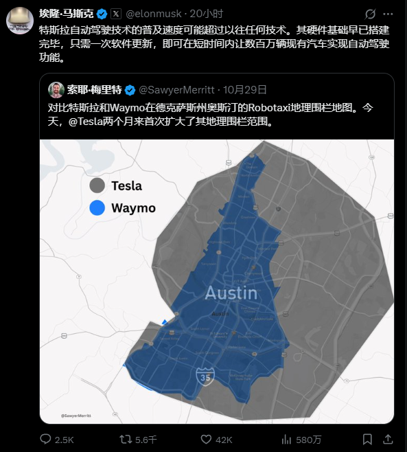 特斯拉在奧斯汀的Robotaxi服務(wù)區(qū)域已擴(kuò)大至243平方英里,幾乎是兩個(gè)月前覆蓋范圍的三倍,遠(yuǎn)超Waymo約90平方英里的服務(wù)區(qū)域。這是特斯拉自8月以來(lái)在奧斯汀進(jìn)行的第二次重大服務(wù)范圍擴(kuò)展,顯示了公司在自動(dòng)駕駛出行市場(chǎng)搶占主導(dǎo)地位的決心。隨著特斯拉與Waymo競(jìng)相證明技術(shù)規(guī)?;芰涂煽啃?,真正的競(jìng)爭(zhēng)或許在于誰(shuí)能以更快的速度在整個(gè)車(chē)隊(duì)中實(shí)現(xiàn)技術(shù)部署。